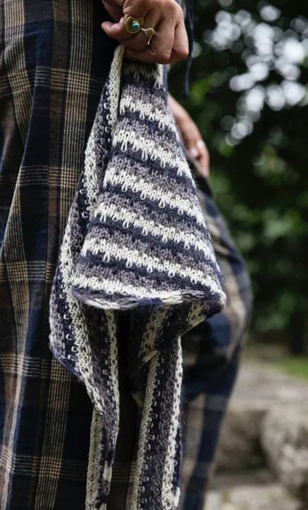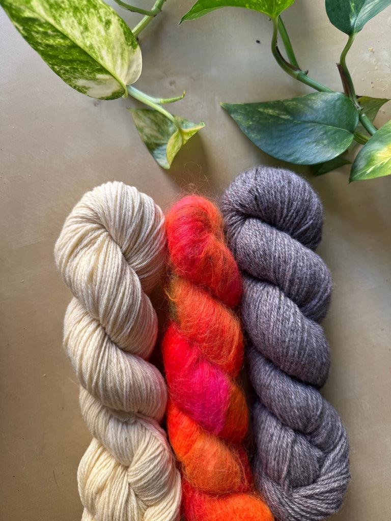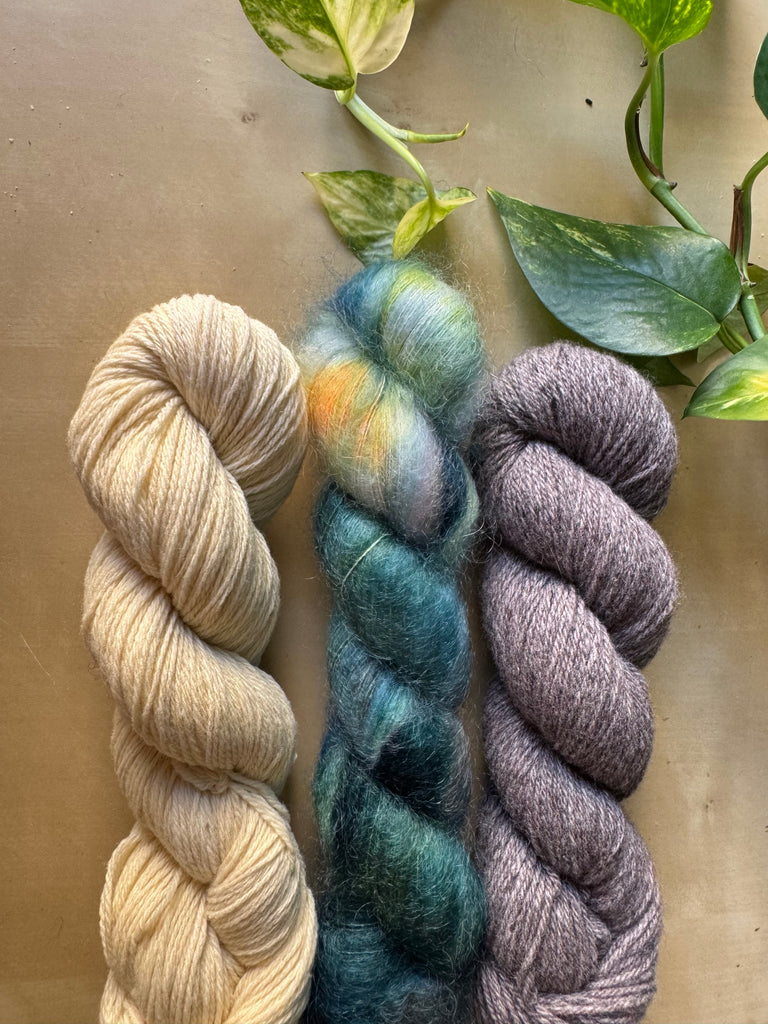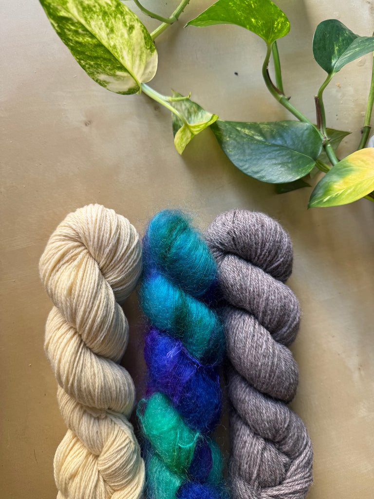 You will receive, one skein of Moires & one of Samskara, in theeir Natural colors and a Poseidon in the color of your choosing (sample was made with Star Wars)